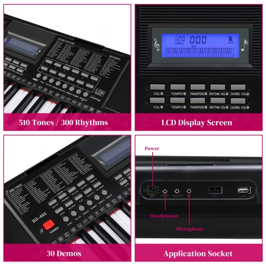 The Glarry GEP-105 61 Key Portable Keyboard is the perfect instrument for beginning players, complete with 510 timbres, 300 rhythms, 30 demo songs, an LCD display with 3 teaching modes (Single-finger, Follow, Concert), and headphones and microphones. The keyboard also has comprehensive functions and built-in two stereo speakers that provide excellent sound quality.