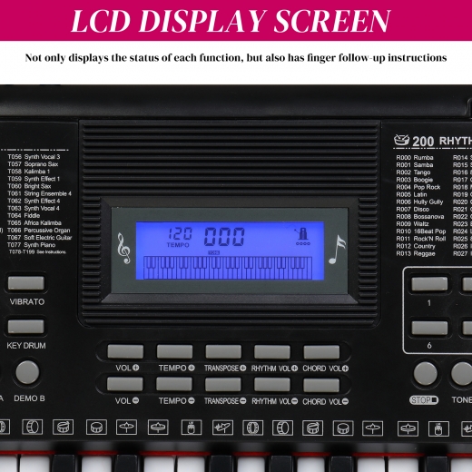 1. LCD Display Screen: Equipped with an LCD display, this keyboard not only displays the status of each function but also has finger follow-up instructions. Unlike ordinary LED screens that can only display numbers, this screen displays dynamics.