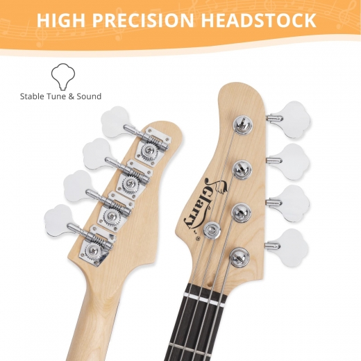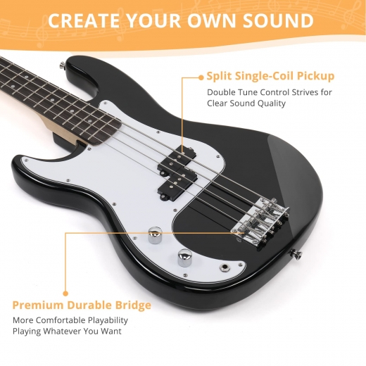 With its split single-coil pickup, 1 volume and 1 tone control knob, this PB-style bass guitar can play anything from blues to rock. Its thicker steel strings and larger string tension provide stable tune, producing better tone display than ordinary guitars.