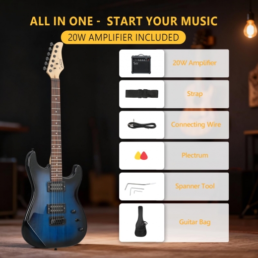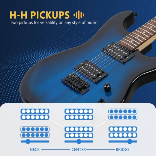 DOUBLE PICKUPS & 20W AMP FOR VERSATILE SOUND: The H-H Pickups design gives you bright clear tones and thicker rock sounds in one eletric guitar, so you can switch styles from blues to rock with simple controls. Paired with the included 20W electric guitar amplifier, you can adjust gain, bass, treble and volume to shape your sound for practice or small jams.