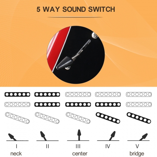 Our guitar features a classic and simple control layout, including a 5-way switch, two tone knobs, and one volume knob, providing intuitive and easy access to your sound.